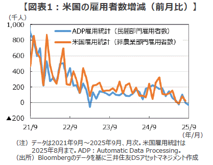 ■米連邦準備制度理事会(FRB)は2025年9月17日、9カ月ぶりに0.25%の利下げを実施しました。パウエルFRB議長は米連邦公開市場委員会(FOMC)後の記者会見で、雇用の下振れリスクの高まりを指摘し、今回の利下げは「リスク管理的な一手」と述べました。また、FOMC参加者による経済見通しでは、2025年内にあと2回、合計0.5%の利下げが見込まれています。図表1の通り、雇用者数の伸びが減速傾向にあることを踏まえると、連続利下げの可能性が意識されそうです。