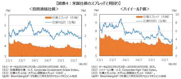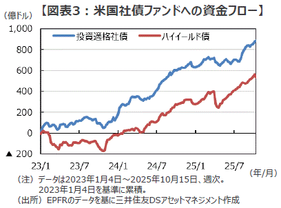 ■米国社債市場では、良好な投資環境が続いています。調査会社EPFRによる投資信託を通じた資金フローを見ると、米国の相互関税が発表された4月上旬には、ハイイールド債(ダブルB格以下の低格付け社債)を中心に資金流出が見られました。しかし、その後は関税交渉の進展を受けて、市場のリスク選好が強まり、資金流入傾向が続いています。また、投資適格社債(トリプルB格以上の高格付け社債)では、雇用市場の悪化を背景に2025年内の利下げ観測が高まった8月以降、資金流入が加速しています(図表3)。