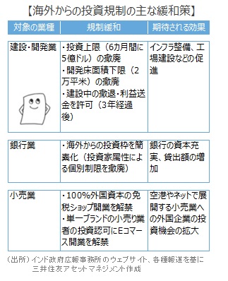 ■ただし、モディ政権は11月10日に建設・開発業、銀行業、小売業、製造業など15の分野に関し、海 外からの投資の上限枠の撤廃や引き上げ、投資認可手続きの簡素化などを発表しました。