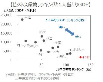 ■「ビジネス環境」ランキングの上位ほど、1人当たりGDPも高い傾向が見られます。モディノミクスの進展、所得水準向上に伴い、ランキングも上向くと考えられます。