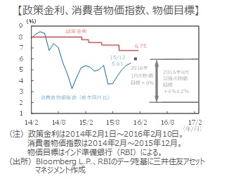 ■RBIは、16年1月の消費者物価指数(本日発表予定)が、当初ターゲット(年+6%以下)に収まったと見ています。市場でも+5.4%程度と予想されています。「物価安定」の背景には、政府の経済構造改革でインフラ整備が進み野菜などの流通価格が抑えられていることや原油安の恩恵などがあります。