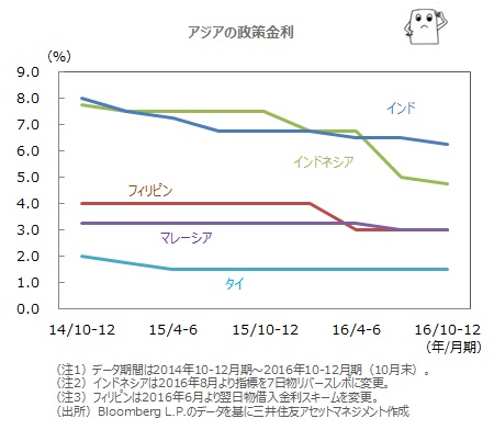 ■インドやASEAN4では、今後もインフレ率の落ち着きや通貨の安定を背景に、「緩和的な金融政策」が続くと見込まれます。7年ぶりに利下げを実施したマレーシアについては、年内にも追加利下げが予想されます。また、17年にも見込まれる総選挙を控えたタイや10月に利下げを実施したインドも、17年上期にかけ利下げを行う可能性があります。「緩和的な金融政策」の継続が、今後のアジアの経済成長や金融市場の安定に寄与すると期待されます。