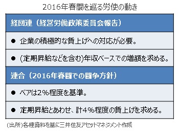 ■一方、労働組合の中央組織である連合も、2016年春闘のベア目標を「2%程度」とし、要求の勢いを2015年の「2%以上」からやや弱めました。このように賃上げについては労使とも昨年ほどの強気な姿勢はみられていません。