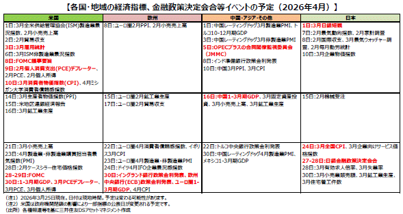 ■30日には、米国の1-3月期実質GDP成長率が公表されます。10-12月期は、政府機関の一部閉鎖に伴う政府支出の減少が下押し要因となり、成長率は大幅に減速しました。1-3月期は、政府支出の正常化がどの程度成長率に寄与するかに注目が集まります。また、AI関連投資が引き続き設備投資を下支えするか、税還付などを背景に個人消費が底堅く推移するかなども焦点となります。