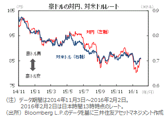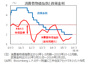 ■15年12月の失業率は5.8%と、直近のピーク(15年7月6.3%)から下落傾向にあり、また、消費者物価指数の上昇率は低位ながら上向きつつあります。こうしたことから、利下げ観測はやや後退しています。ただしRBAは今回の声明で、最近の金融市場の混乱が内外の需要を弱める可能性に言及し、低インフレ下で必要な場合はさらなる緩和の余地もあるとしました。