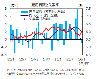 ■2016年1月の雇用者数は前月比0.8万人の減少、失業率は同+0.2%ポイント上昇の6.0%となりました。2カ月連続で、やや低調な結果です。昨年10月、11月の雇用増加ペースが過去最高水準だった反動の可能性が高いと考えられます。月ごとの振れを均した政府公表のトレンド値を見ると、1月は+2.0万人でした。前月の+2.7万人からは鈍化したものの、緩やかな改善基調を維持しています。