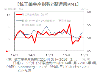 ■製造業の景況感は16年1月に好不況の境目である50を回復、3月は更に改善し52.4となりました。今後も堅調な内需を反映して、増加基調で推移することが見込まれます。