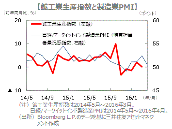 ■16年4月の製造業の景況感は50.5と前月の52.4から低下しましたが、好不況の境目である50を引き続き上回っています。足元の生産は若干鈍化しましたが、公務員の給与引き上げなどを背景に、内需は堅調に推移すると見られ、鉱工業生産の伸びは緩やかに高まると見込まれます。