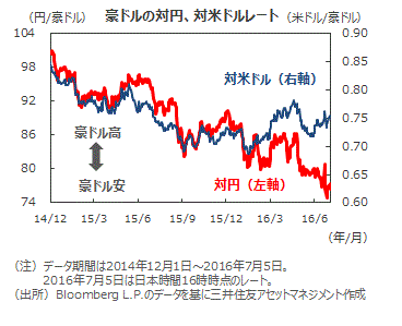 ■やや長い期間で見ると、米国の利上げ先送りで豪ドルの対米ドル相場は、上昇傾向にあります。一方、対円では、「質への逃避」の動きの強まりから円が買われ、下落しています。しかし、先進国の中では豪州金利が相対的に高いことを踏まえると、今後、「質への逃避」の動きが後退するにつれ、豪ドルの対円相場は底堅く推移すると予想されます。