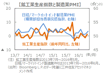 ■5月の鉱工業生産指数は、前年同月比+1.2%と2カ月ぶりにプラスに転じました。業種別にみると、一次金属、化学などが堅調です。一方、6月の製造業PMIは51.7と2カ月連続で上昇しました。生産のモメンタムが強まる傾向にあり、年後半にかけての内需拡大が予想されます。