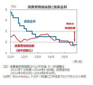 ■一方、物価は落ち着いています。直近16年4-6月期の消費者物価上昇率(※)は、前年同期比+1.7%となりました。RBAの目標値同+2%~+3%の下限を下回った状況が続いています。