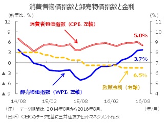 ■16年8月の消費者物価指数(CPI)は前年同月比+5.0%と、7月の同+6.1%からインド準備銀行(中央銀行、RBI)が17年3月時点の目標としている水準まで鈍化しました。主に食品価格(野菜と豆類)の下落が寄与しました。