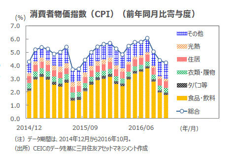 ■2016年10月の消費者物価指数は前年同月比+4.2%(9月同+4.4%)と3カ月連続で鈍化しました。