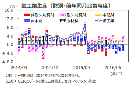 ■2016年9月の鉱工業生産指数は、前年同月比+0.7%と市場予想の同+0.5%を上回り、8月の同▲0.7%からプラスに転じました。