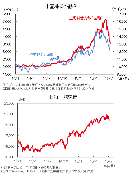 ■中国政府当局は6月27日の追加利下げと預金準備率引き下げを皮切りに、矢継ぎ早に株価対策を講じてきました。しかし、8日の上海と深セン両証券取引所で売買停止銘柄が1,000銘柄超と全体の3割超に達したことから投資家心理がさらに冷え込みました。7月5日にギリシャが国民投票で欧州連合の提案する財政緊縮案を否決し、ユーロ圏離脱の可能性が高まったことも影響し、香港市場も連日の下落となっています。