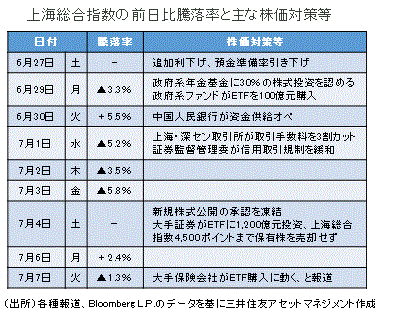 ■中国株式市場は、引き続き振幅の大きい不安定な値動きが見込まれます。株式市場下落の経済への悪影響が懸念され、追加金融緩和や財政拡大、行政指導の強化など政策総動員の可能性もありそうです。