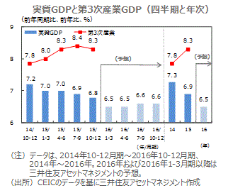 ■サービス業などの第3次産業の成長率は、15年通年で8.3%と前年から伸び率が加速しました。インターネットを通じた商取引や物流網の整備などの政策の後押しもあり、第3次産業を軸とする経済構造への転換が進んでいます。