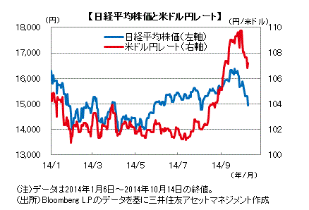 ■14日の日経平均株価は、前日比▲364.04円(同▲2.38%)の14,936.51円と大幅に下落しました。下落は5取引日連続となり、今年8月以来の15,000円割れとなりました。