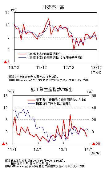ただし、3カ月移動平均で見ると、9月以降4カ月連続で同+5%台となっています。2013年12月の失業率は4.3%と前月の4.6%から低下し、現行の統計が開始された2002年3月以降の最低水準になりました。良好な雇用情勢が下支えとなり、消費は今後も底堅い傾向が続くと思われます。