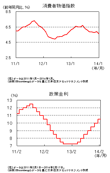 2014年1月の消費者物価指数は前年同月比+5.59%と、市場予想の同+5.65%、前月の同+5.91%をいずれも下回りました。内訳を見ると、食品は同+7.26%と全体よりも高いものの、前月を1%以上下回り、全体が前月から低下した主な要因になりました。一方、サービスと教育は前月を上回り8%台となりました。良好な雇用情勢が要因の一つと思われます。