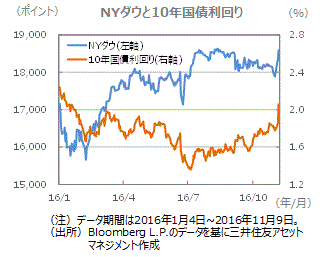 ■8日の大統領選挙でトランプ氏が勝利し、米国の第45代大統領に決定しました。日本やアジア市場ではトランプ氏の政策に対する不透明感もあり、株式は大きく調整しました。9日の米国市場では、株高、債券安(金利上昇)となりました。9日のNYダウは18,589.69ドル、約257ドルの上昇となり、10年国債利回りは2.05%と1月25日以来の2%台となりました。株高と長期金利の上昇を受け、為替市場ではドルが対主要通貨で上昇しました。
