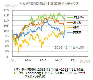 ■セクターの動きを見ると、医薬品、銀行、資本財、エネルギーなどが比較的大きく上昇しました。医薬品や銀行は、薬価引き下げや金融規制強化を主張したクリントン候補の敗退を受けて上昇しました。公共投資や原油採掘の解禁といった政策内容も材料視され、資本財やエネルギーも上昇しました。