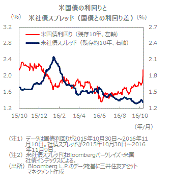 ■その後、米大統領選挙でトランプ候補が勝利し、上下院とも共和党が制した11月9日に利回りは大きく上昇し、今年1月下旬以来となる2%台に乗せました。トランプ氏の考える財政支出の拡大や減税が進むとの思惑が高まったためです。