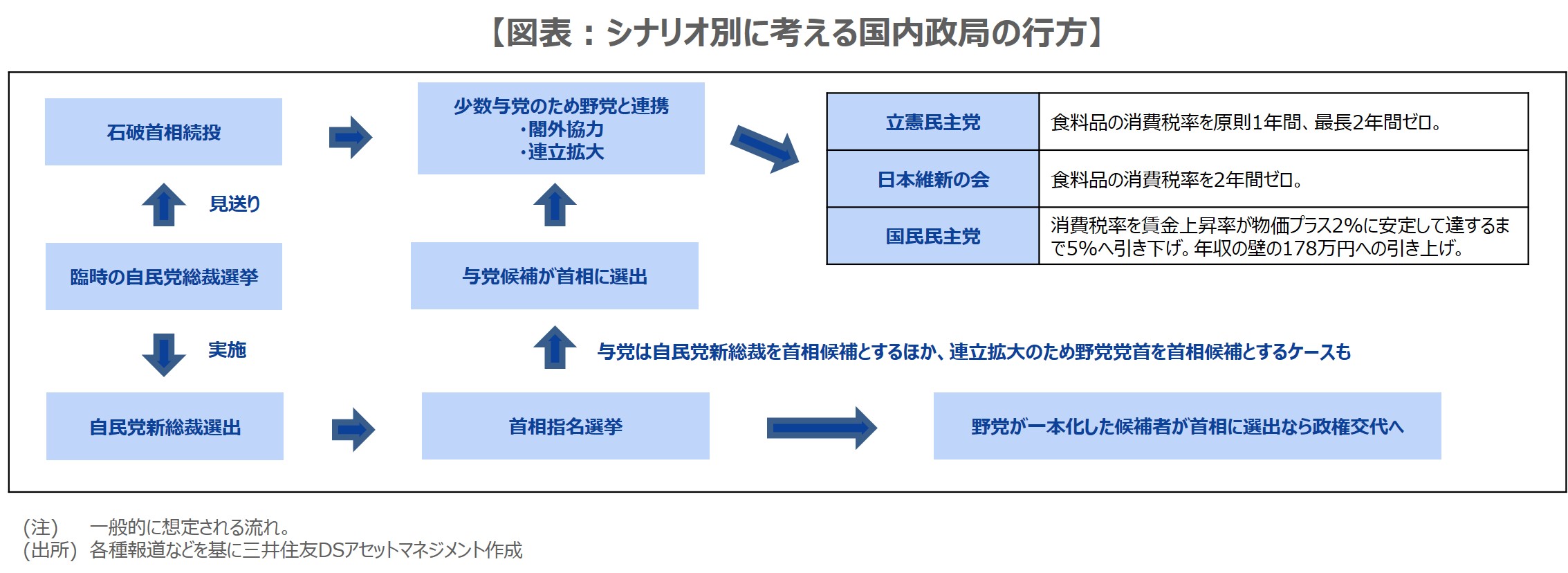 なお、高市氏は積極財政派とされ、野党では国民民主党が年収の壁見直しと消費税率の一律5%への引き下げを掲げています。また、小泉氏は維新の会の吉村洋文代表と親密とされています。ただ、少数与党である以上、①自民党新総裁が国会の首相指名選挙で必ずしも首相に選出されるとは限らず、②国会運営は野党の協力が不可欠です(図表)。そのため、与党がどの野党と協力して財政政策を進めるかの見極めも大切と考えます。