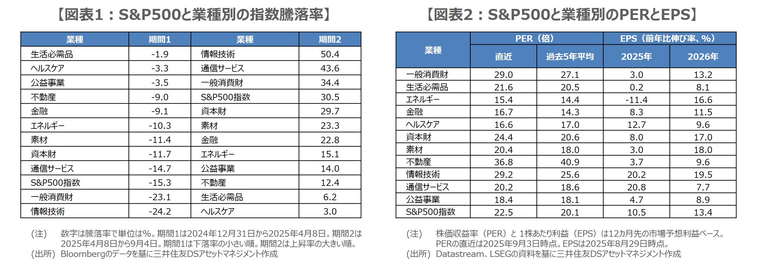 改めて図表1をみると、昨年末から4月8日までの期間では、総じて「内需・ディフェンシブ」のパフォーマンスが「外需・シクリカル」を上回りましたが、4月8日から9月4日までの期間では、このパフォーマンスがおおむね逆転し、「リターン・リバーサル」の動きが確認されます。なお、後者の期間において、上昇率2位の通信サービスにはアルファベットやメタが含まれ、上昇率3位の一般消費財にはアマゾンやテスラが含まれます。