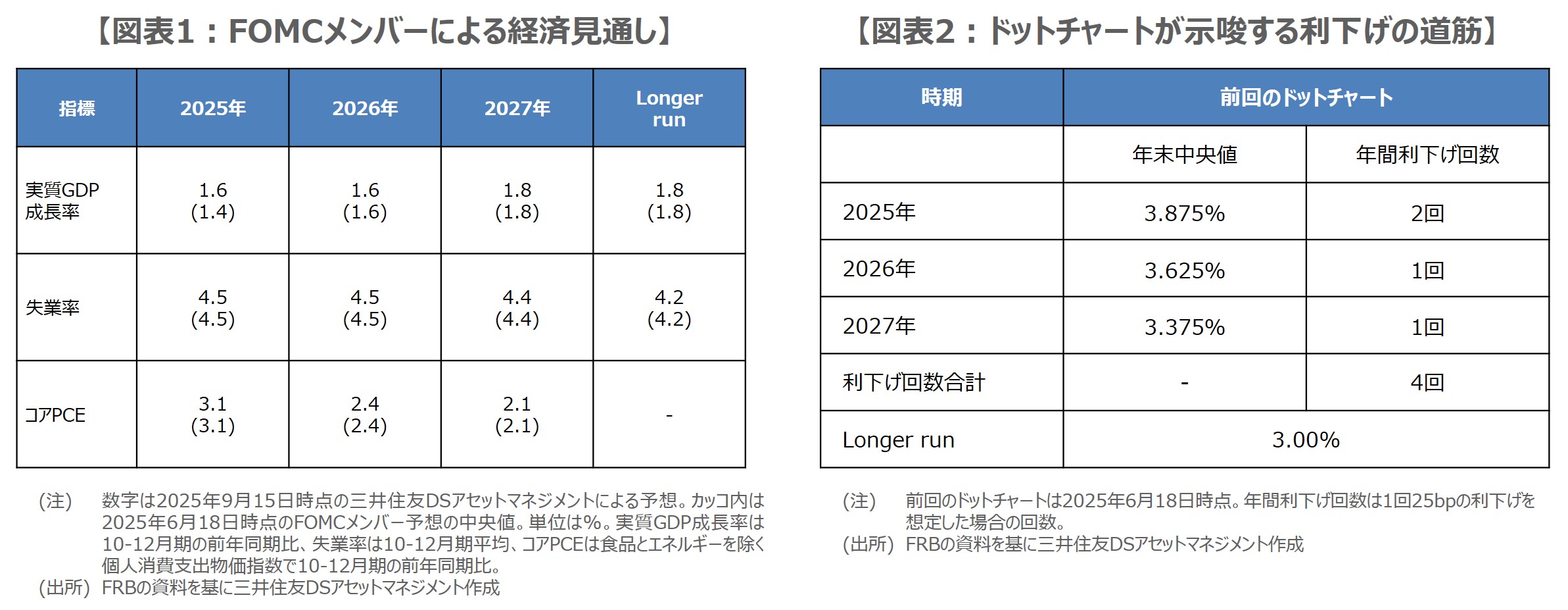 ドットチャートでは、メンバーが適切と考える25bpの利下げ回数について、前回6月時点では、2025年が2回、2026年は1回、2027年は1回との見方が示されていました(図表2)。弊社は今回、2025年は3回となる一方、2026年と2027年はそれぞれ1回ずつで変わらずとみており、利下げは労働市場の減速リスクを踏まえ前倒しで進める一方、インフレへの警戒は続けるという、大まかな方向性が示される公算が大きいと考えています。