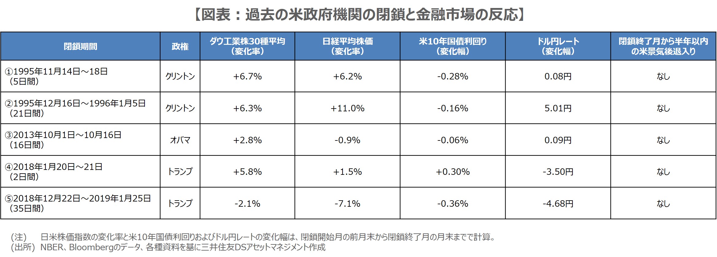 トランプ米大統領は現状、政府機関の閉鎖にあまり危機感を抱いていないように見受けられ、また、民主党も党内のリベラル派への配慮から、つなぎ予算に安易に妥協できない状況にあり、閉鎖が長引くリスクもあります。ただ、過去の例をみる限り、閉鎖がある程度長期化しても、金融市場や経済が大きく混乱する事態には陥っていません(図表)。そのため、閉鎖の長期化リスクは残りますが、現時点で過度に懸念する必要はないと考えています。