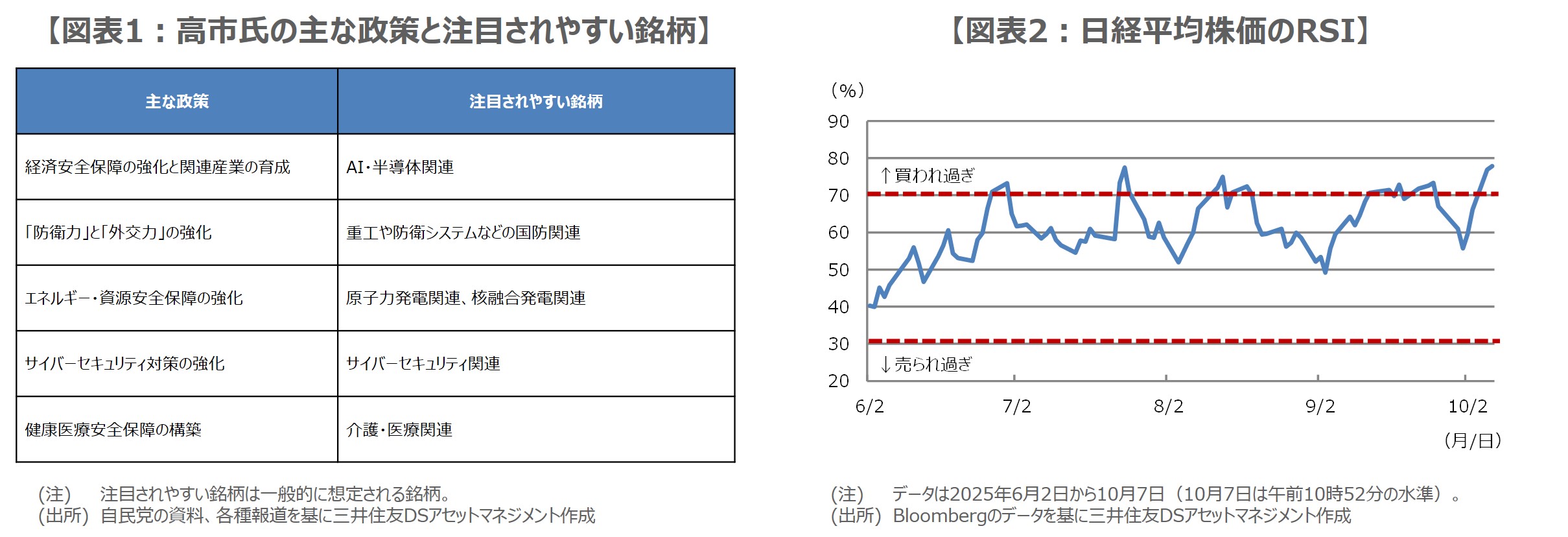 日経平均は本日も続伸し、寄り付き後、ほどなく48,527円33銭の高値をつけました。節目の46,000円、47,000円、48,000円を一気に突破したことで、相場の過熱感をみる「RSI(相対力指数)」は直近で約78%と、買われ過ぎとされる70%水準を超えています(図表2)。日経平均は、48,000円台に乗せたことで、目先は上昇一服も予想されますが、高市氏の政策への期待が維持される限り、大きな崩れは避けられる公算が大きいと思われます。