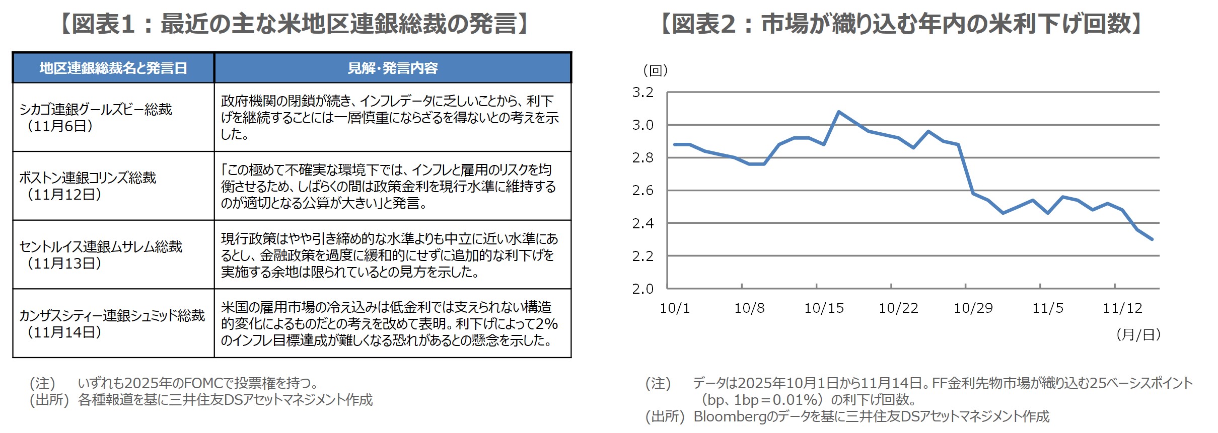 このところ、複数の米地区連銀総裁が12月の利下げに慎重な姿勢を示しており、市場にも相応に影響がみられています。そこで、今回のレポートでは、最近の主な米地区連銀総裁の発言を踏まえ(図表1)、12月の米連邦公開市場委員会(FOMC)における利下げの可能性について考えます。シカゴ連銀のグールズビー総裁は11月6日、米政府機関の一部閉鎖の影響で、インフレ関連のデータが乏しいため、利下げ継続に慎重な姿勢を示しました。