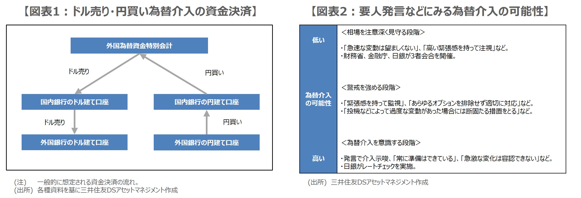 ドル売り・円買いの為替介入について、一般的な資金の流れは図表1の通りです。ドル資金は、為替介入の原資となる財務省所管の「外国為替資金特別会計(外為特会)」から国内銀行のドル建て口座を経て、外国銀行のドル建て口座へ振替が行われます。円資金は、外国銀行の円建て口座から国内銀行の円建て口座を経て、外為特会へ振替が行われます。一連の取引がまとまった金額で実施されれば、為替はドル安・円高に振れやすくなります。