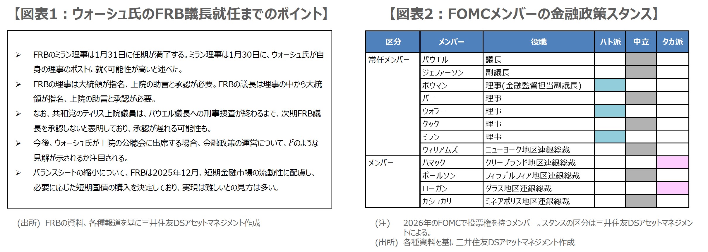 なお、2026年のFOMCで投票権を持つ12名は図表2の通りです。仮に、ウォーシュ氏がハト派姿勢を明確にし、ミラン理事(1月任期満了)の後任を経てFRB議長に就任、パウエル議長が5月に任期満了で退任、新たなハト派の理事が就任となれば、ハト派は4名になります。それでもFOMC全体としては、依然バランスの取れた陣容と判断され、利下げバイアス(偏り)が強まる恐れは小さいとみています。