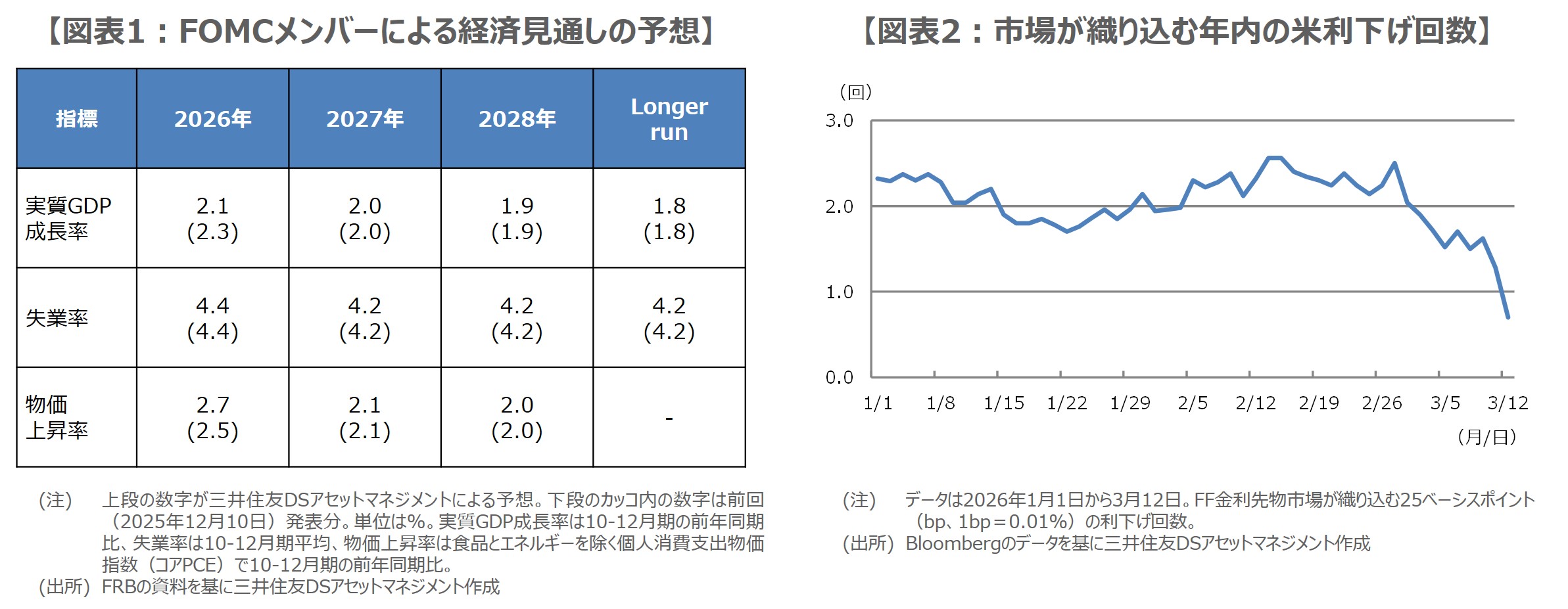 次に、SEPについて、2026年の実質GDP成長率は実勢を反映し下方修正されるとみています(図表1)。失業率は、基調的な雇用者数の伸びはやや弱いものの、労働供給も鈍いため、需給に変化がなく、大きな修正はないと思われます。個人消費支出(PCE)物価指数の伸び率は、原油高がどの程度見通しに反映されるかは読みにくいところですが、食品とエネルギーを除くコア指数の伸びが堅調なため、2026年は上方修正を予想しています。