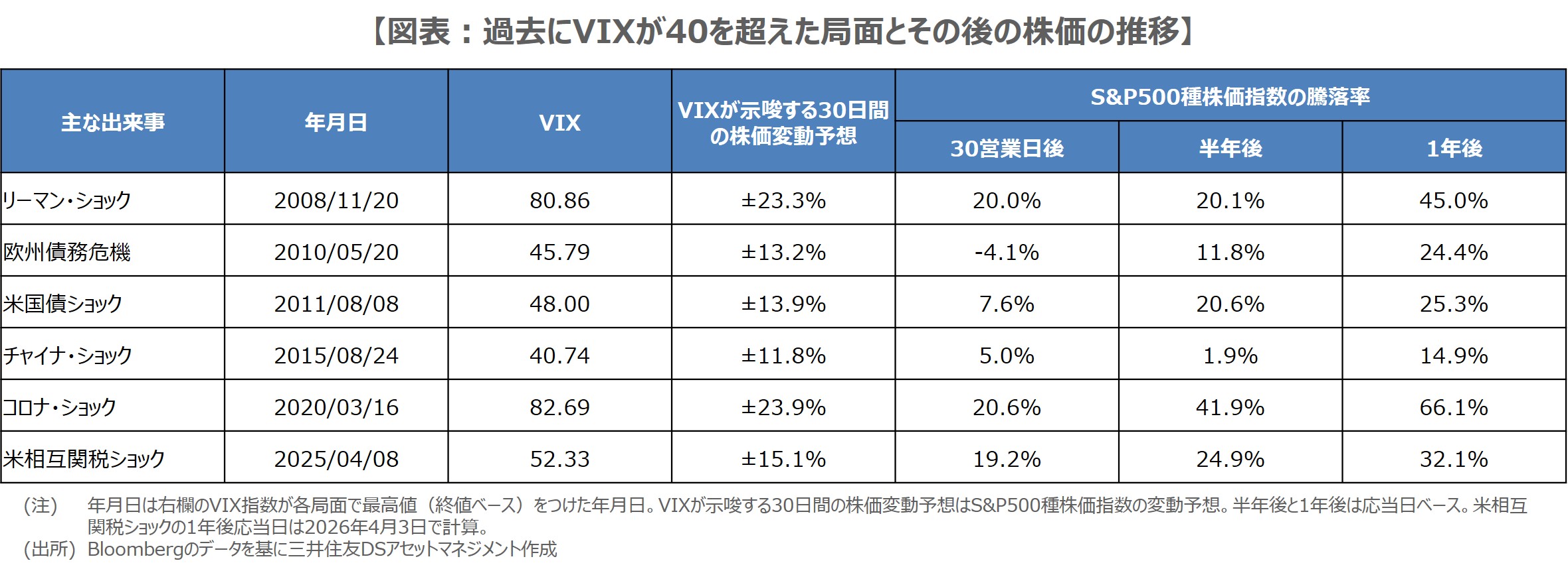一般に、VIXが15~20であれば市場は正常な環境にあり、20を超えると徐々に混乱の度合いが強まり、30を超えると非常に混乱している状態と解釈されます。2025年に米相互関税ショックが発生した際、VIXは4月8日に52.33を記録し、市場の極度の混乱が示唆されました。ただ、S&P500指数は30営業日後に19.2%、半年後に24.9%、1年後に32.1%それぞれ上昇し、過去の局面と同様、30営業日後には落ち着きを取り戻しました。