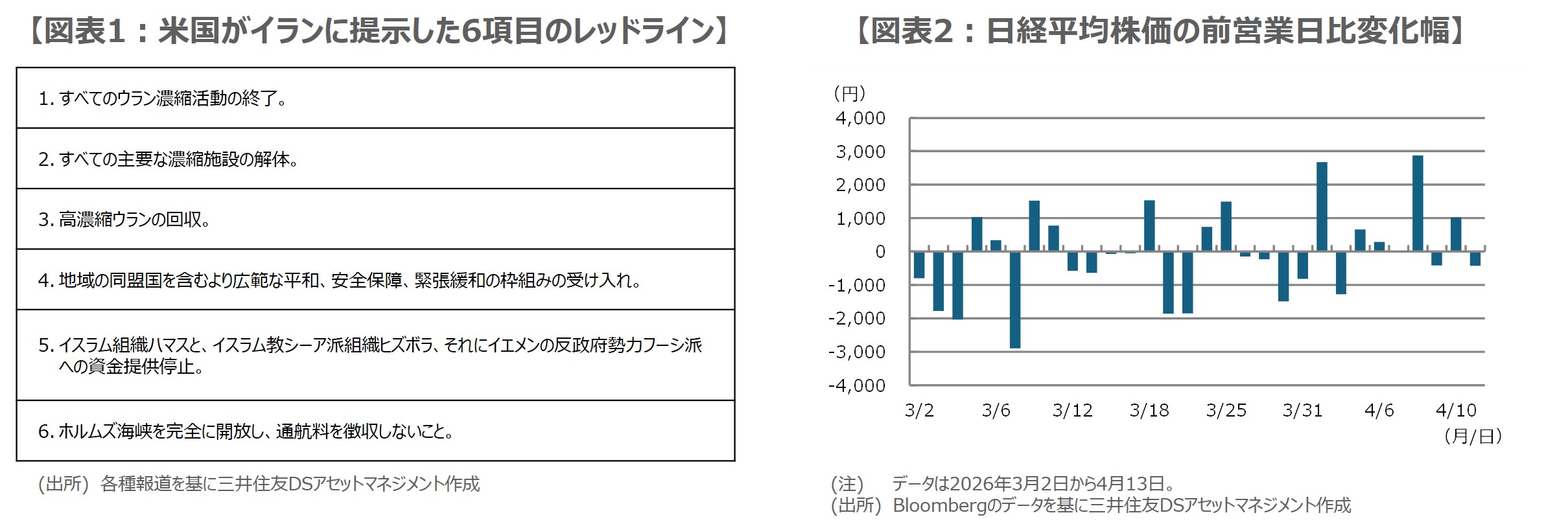 ただ、米国のホルムズ海峡の逆封鎖には注意が必要で、仮に同海峡で米国とイランの武力衝突が発生した場合は、和平協議への影響(一時中断など)も予想されます。なお、日経平均株価の前営業日比の変化幅をみると、3月は下げ幅の大きさが目立ちましたが、4月に入ると上げ幅の大きさが目立つようになりました(図表2)。和平協議の進展やホルムズ海峡の動向の見極めは大切ですが、イラン情勢を巡る悪材料は相応に織り込まれたと思われます。