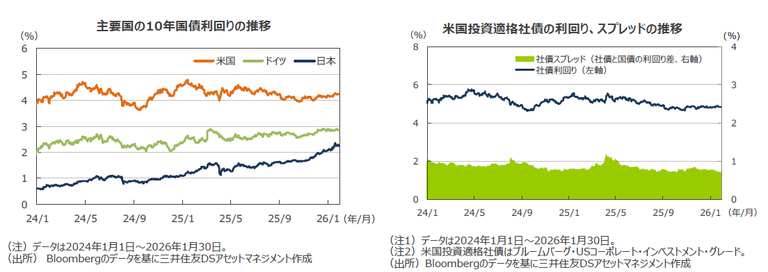 米国の10年国債利回り(長期金利)は上昇しました。 ①グリーンランドをめぐる米欧の対立から欧州勢が米ドル資産を売却したとみられる、②日本からのキャリートレードが減少するとの懸念、などが要因です。ドイツの長期金利は低下しました。米国との対立への懸念から、一時的な安全資産へのシフトが起きたことが要因のようです。日本では月間で長期金利は上昇しましたが、月末には消費者物価の上昇率低下や、衆議院解散などから材料出尽くしとなり低下しました。 |