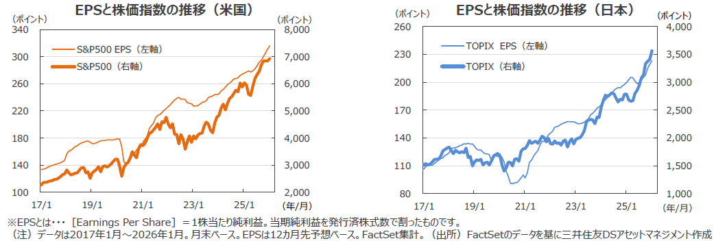 ●米ファクトセット(FactSet)によれば、日米の企業業績の見通しは堅調です。1月末の米S&P500種指数の予想1株当たり純利益(EPS)は前年同月比+14.6%、TOPIXの予想EPSは同+11.8%となりました。