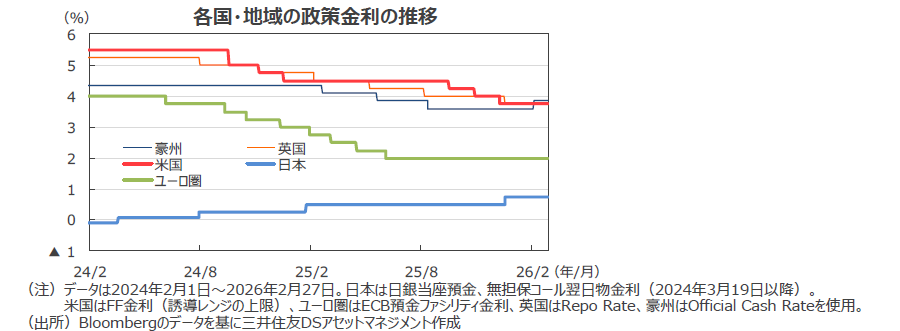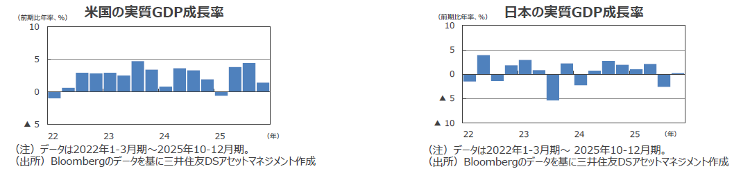 ●米国の26年の実質GDP成長率見通しを+2.5%、27年見通しを+1.9%としました。政府機関閉鎖の影響で10-12月期の成長は下押しされたようですが、懸念したほどの雇用情勢の悪化はなかった模様です。所得が安定していることや資産効果もあり、消費は底固く推移しています。AI関連中心に設備投資も好調で、減税効果の発現、政府機関再開に伴う成長加速などで、景気は持ち直すと予想しています。