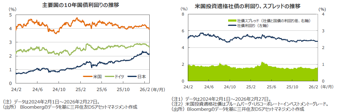 米国の10年国債利回り(長期金利)は低下しました。 月初はウォーシュ氏が議長に指名されたことを警戒し、長期金利は上昇しました。しかし、①小売売上高が予想を下回った、②ローン延滞率の上昇、などから中旬以降は低下しました。ドイツでは、ユーロ高が輸入の増加を通じてインフレ率を低下させる、などの期待から長期金利は低下しました。日本でも長期金利は低下しました。消費者物価の上昇率が急低下しており、日銀の利上げ観測が後退しているようです。