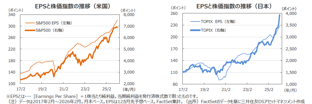 ●米ファクトセット(FactSet)によれば、日米の企業業績の見通しは堅調です。2月末の米S&P500種指数の予想1株当たり純利益(EPS)は前年同月比+16.0%、TOPIXの予想EPSは同+12.7%となりました。