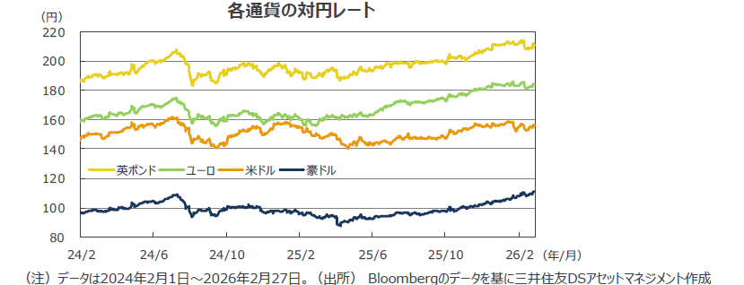 選挙期間中、高市首相は円安志向との思惑から円安が進みましたが、選挙後は材料出尽くしから円高となりました。しかし、1月のレートチェックが米国当局によるものとニュースが報じられると、再び円安となり、月間でも円安となりました。欧州勢は米ドル資産を売却した模様で、ユーロは米ドルに対し底堅い展開となりました。貴金属など商品市況が堅調に推移しているため、豪ドルなど資源国通貨は上昇しました。