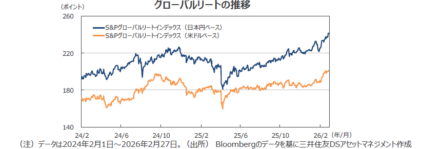 ●日本では、オフィス賃貸市場のファンダメンタルズ改善が続くとともに、首都圏のマンション価格も、ペースは鈍っていますが、上昇が続いています。東証の投資家主体別売買動向によると、1月、投資信託、事業法人、個人が買い越す一方で、海外投資家、その他金融機関(保険、銀行除く)が売り越しとなりました。S&Pグローバルリート指数の2月のリターンは、構成比の大きい米国の上昇と、欧州各国が全般的に好調で、2番目に大きい豪州市場の下落をカバーし、前月末比+5.9%となりました。月間の換算用の米ドル・円レートが円安となり、円ベースのリターンは同+7.2%となりました。