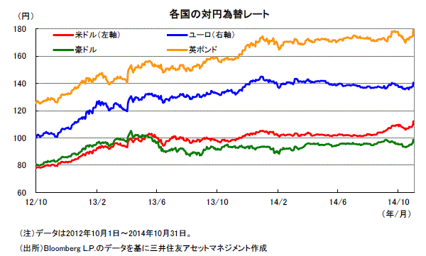 金利先物などから見ると、2015年半ばから後半の米国の利上げ開始が織り込まれています。ドイツ景気の弱含み、物価の低迷などから見て、ECBが資産購入の拡大などの追加策を実施する可能性が高まっています。日銀は今回、マネタリーベース、長期国債購入増額、ETFやREIT購入額の増加による量的・質的金融緩和の拡充を決めたことから、当面はこれらの政策効果の浸透を見極める姿勢とみられます。