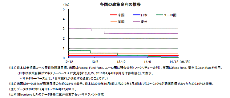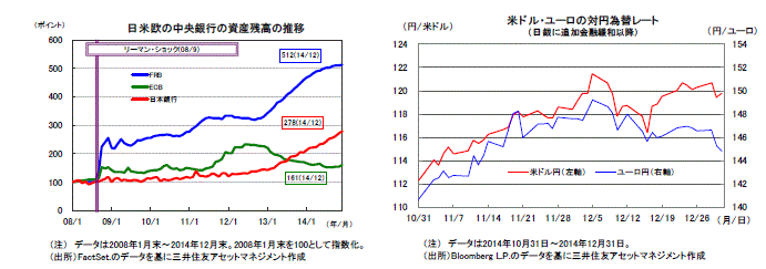 FRBは、低金利政策を忍耐強く行う考えです。ECBは2015年1-3月期にこれまでの金融緩和を見直し、資産購入を拡大する方針です。日銀は、マネタリーベースを年間約80兆円拡大させる強力な金融緩和を続けています。