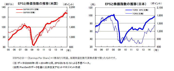 主要米国企業の2015年の予想増益率は+8.1%と2014年の+7.5%から小幅に加速する見通しです。日本の主要企業の2015年度の経常利益は、円安進展、米国景気の回復、消費税率引き上げ延期などから、2ケタに達する見込みです。日米ともに堅調な企業業績を背景に、株価は底堅い推移が見込まれます。
