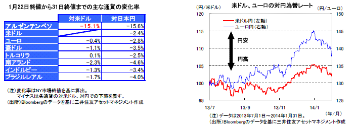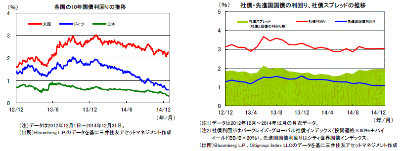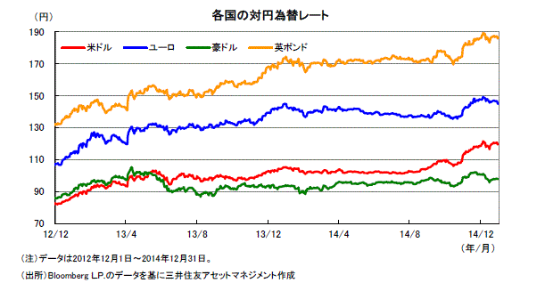 2014年末の原油価格(NY先物)は2013年末のおよそ半値と、大きく下落しました。米国などエネルギーを多く消費する国では、企業や家計の受けるメリットへの期待から株価が上昇し、また期待インフレ率が抑制されて国債の利回り低下の一因となりました。一方、資源国の株式や通貨は下落し、投資家のリスク回避的な動きの拡大から、新興国国債やハイ・イールド債券などの格付けが低い債券の価格が下落しました。