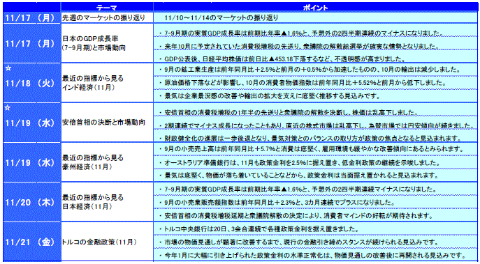 日本株は下落しました。7-9月期のGDPが予想外のマイナスとなったことや、衆議院解散決定などが株価の下押し要因になりました。一方、消費税増税先送りの決定や円安の進行などから、下落幅は小幅にとどまりました。